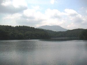 18日、暑い日差しと急な登りの斑尾山から大明神岳に登り、眼下に野尻湖を望み、