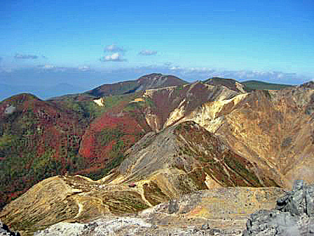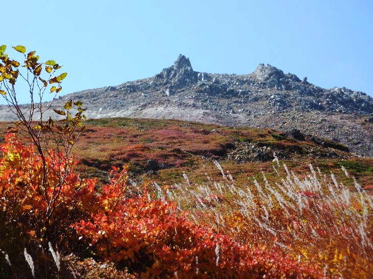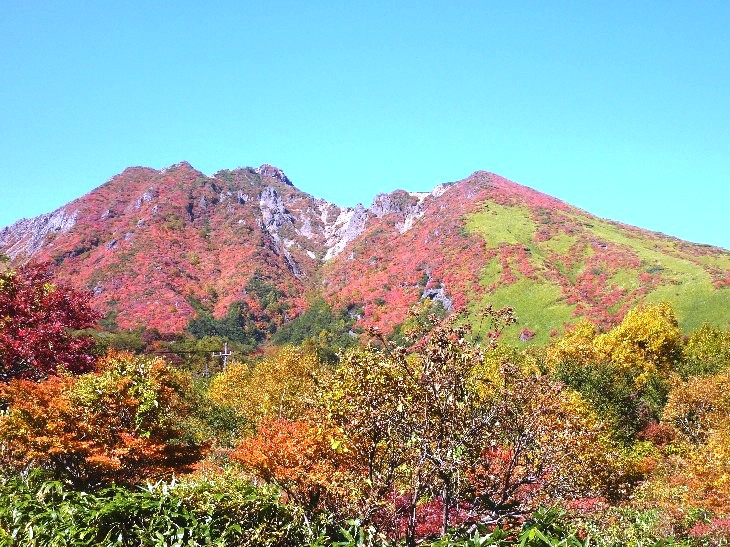山麓からの朝日岳の紅葉 |
