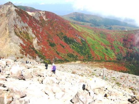 朝日岳の絶好の紅葉を眺めながら下る