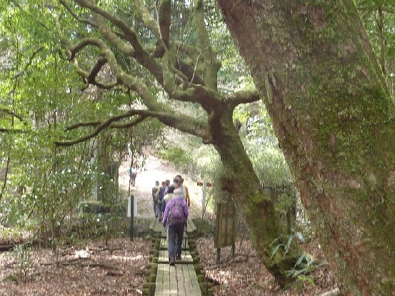 展望広場で芦ノ湖を背に集合写真を撮り、箱根関所跡から熱海行きのバスに乗り函南原生林入口で降りて原生林に入る。