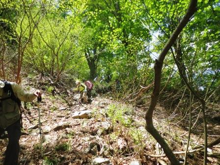 岩がゴロゴロ、かなりの急坂を下る。ゆっくりでないと危ない。