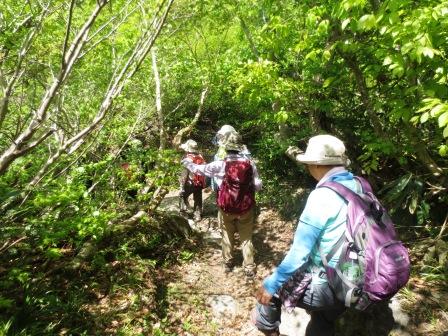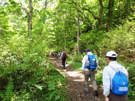 まぶしいぐらいのブナ林の新緑の中をスタート。