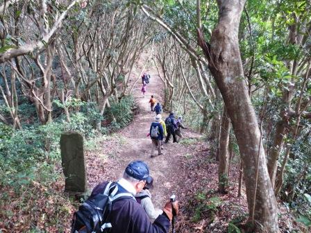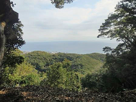 樹間から太平洋が見え、展望が良い。早目の昼食をとり、下りは、枯葉の積もった緩やかな樹林帯の林を降り、潮騒の音を聞きながら農業用水の含有戸溜池に経ると、のどかな田園地帯が続く。