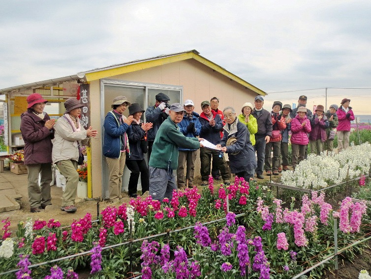 今回、通算25回参加の石井龍三会員に見事なお花畑の中で参加賞を差上げた。