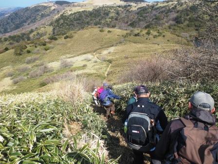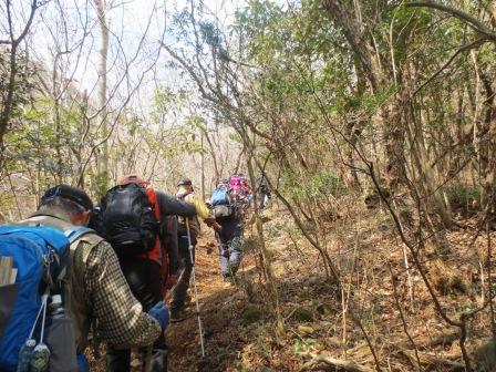 急な下りが続く。雪も残っていて滑る。 |