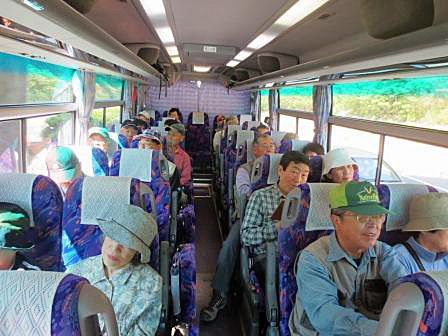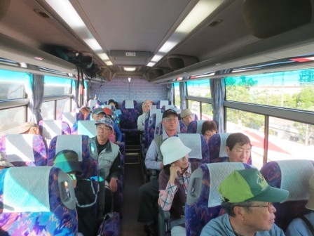 今回40人乗りの貸切バスを利用。横浜天理ビル前から朝8時出発。正席33人乗りバスなので中は余裕でゆったり。快適な道中だ。