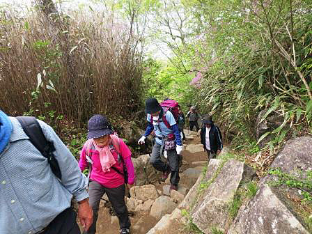 赤いミツバツツジを見ながら、急坂の丸太の階段を登って行く。結構厳しい。
