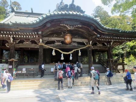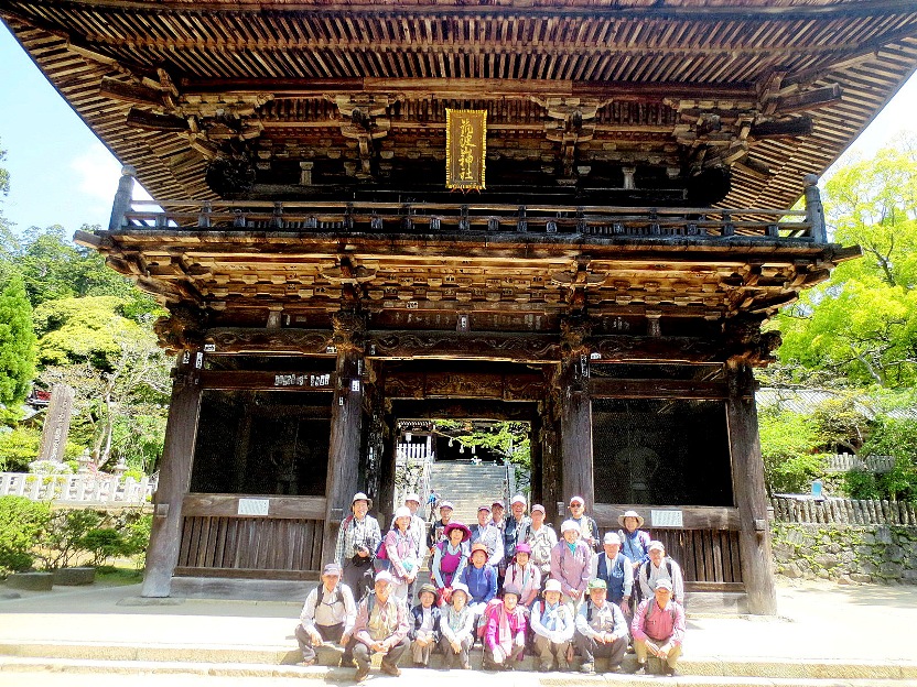 筑波山神社山門前に到着。全員で記念写真を撮る。
