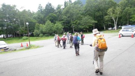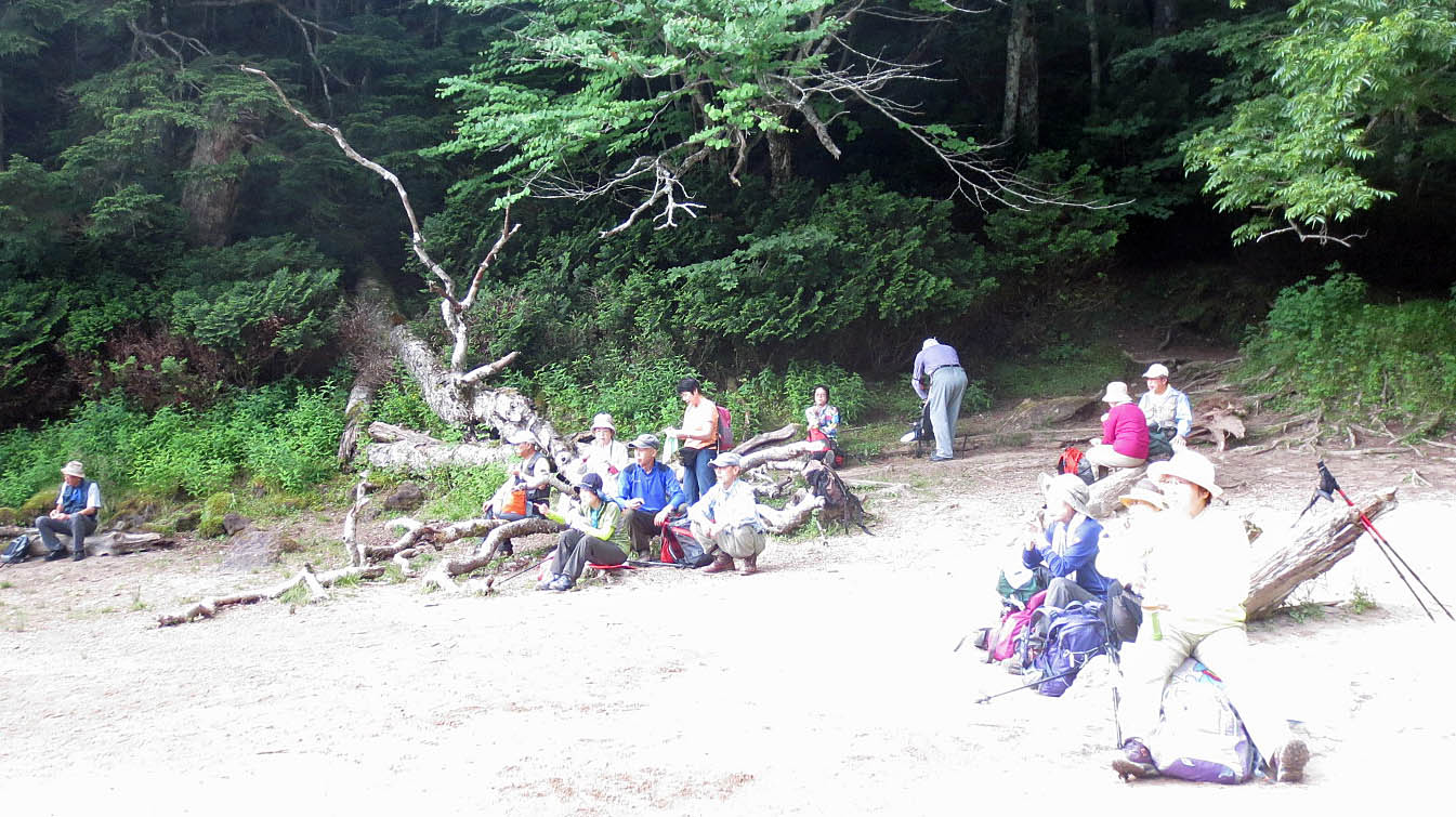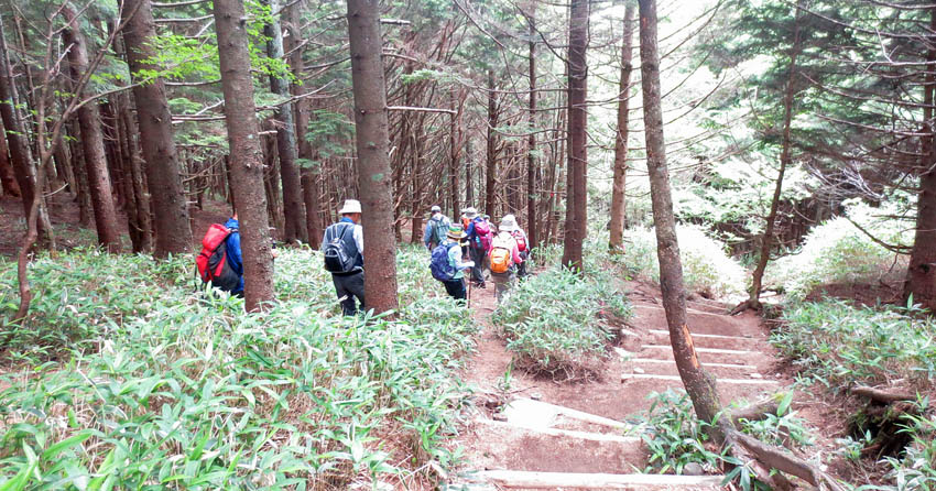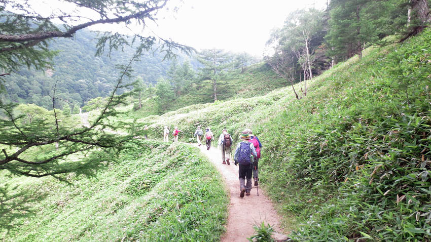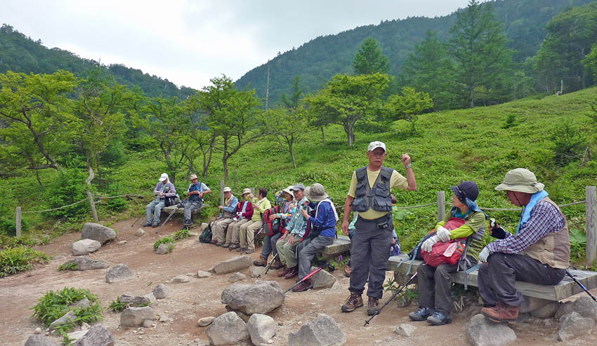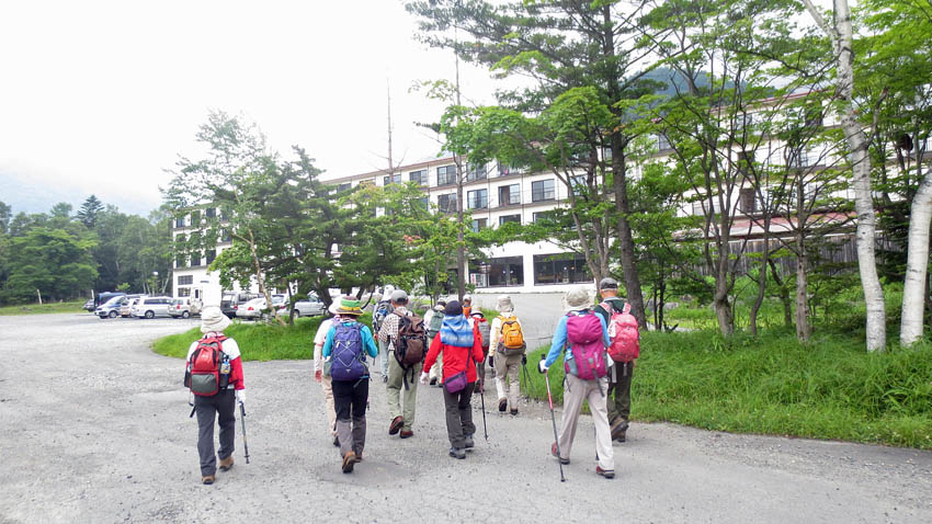更に樹林帯を下るとやがて予定の時間に光徳牧場に着きました。牧場の美味しいアイスクリームや濃厚な牛乳に舌鼓をうち整理体操をしようとした時、突然にわか雨が激しく降ってきました。帰りのバス停に急いで移動しホテルの玄関口で雨宿りをし路線バスで帰ってきました。今日は合宿最終日でじっくりと硫黄線を味わい、ビールとワインで酔い痴れ、部屋では二次会でそれぞれの感想を述べ床に就きました。総じて今回の合宿を通して、自然と向き合い充実した自分を感じたのではないかと思います。