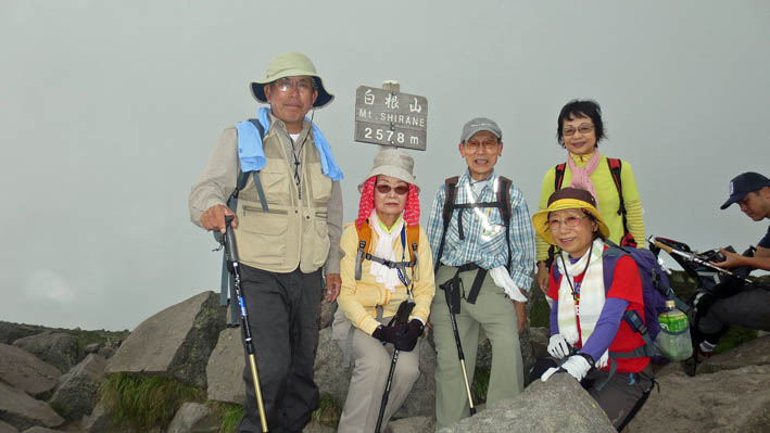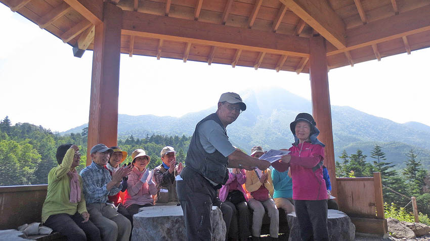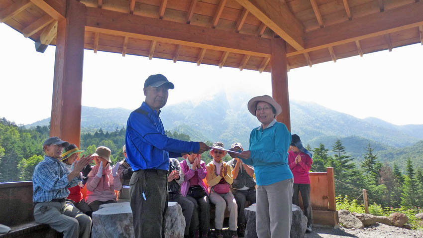 <瀬川理維子さん、75回参加賞> <白根山をバックに記念写真>