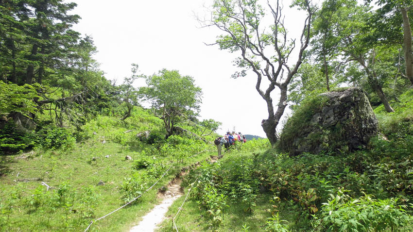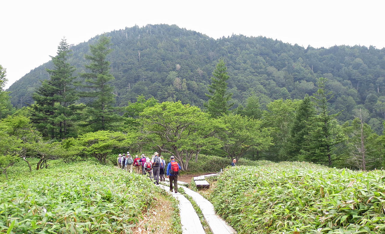 勝堂聖人が村人を苦しめた大蛇を沈めたという刈込湖は綺麗なエメラルドグリーンで神秘的でした。ここで大きなおにぎりを食べ、記念写真を撮り切込湖を巡って暫く樹林帯の中を抜けると明るく開けた涸れ沼に着きました。