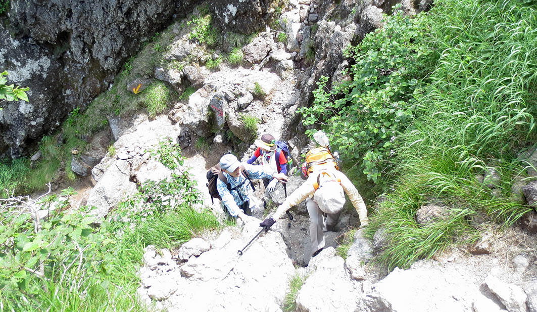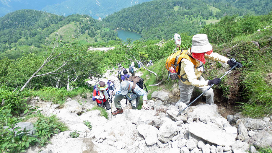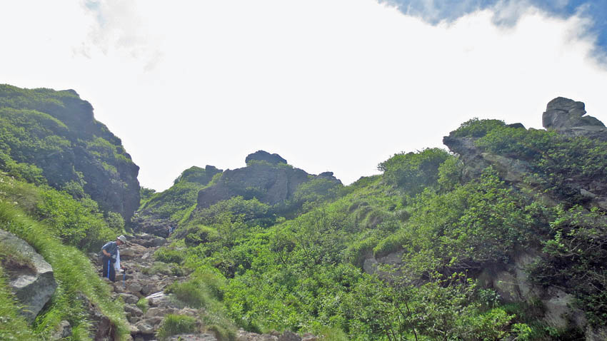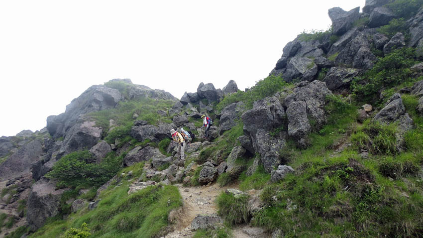 <見上げれば日光白根山の山頂が> <岩がゴロゴロ、厳しい急坂を登って行く。>
