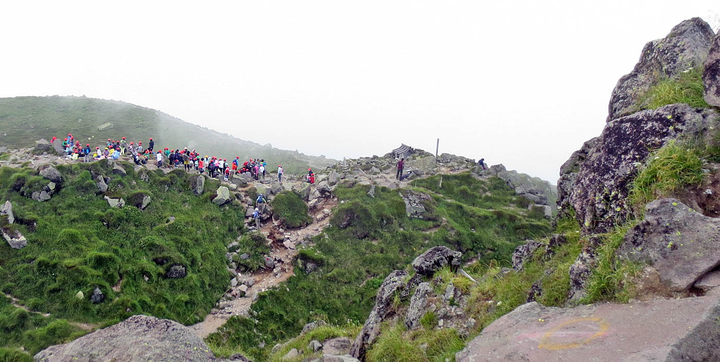 <もうすぐ山頂> <やっと山頂に到着。 空は雲で覆われる>