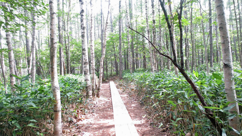 ここではミヤマオダマキが可憐な姿を見せてくれました。ここで残りの大きなおにぎりを食べ、山王峠の急登を越えて白樺の樹林帯を下っていると、突然鹿が眼前を横切りました。最初一瞬何が起こったのかよくわかりませんでしたが、横を見ると鹿が白いお尻を向けてこちらを見ていました。