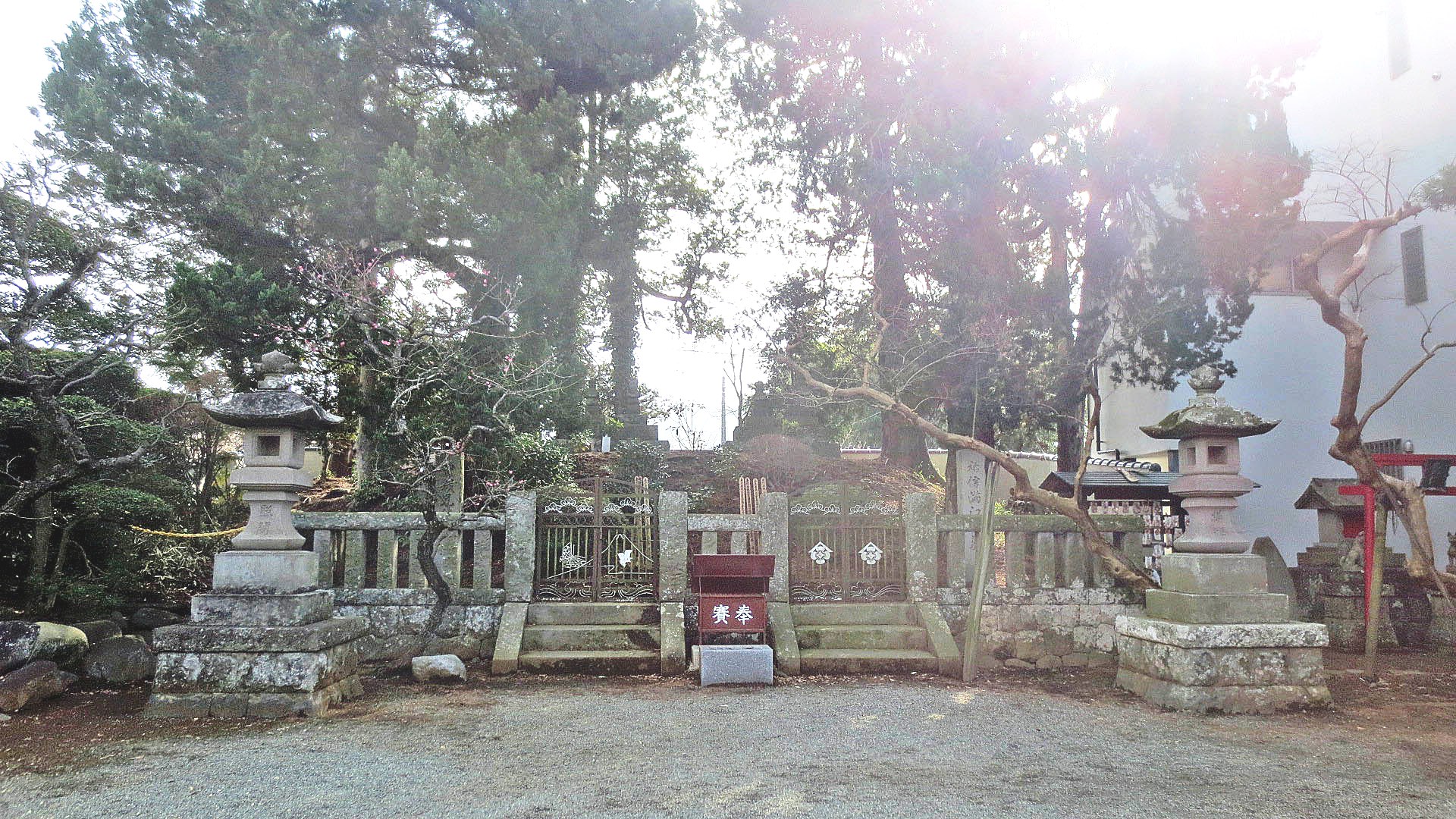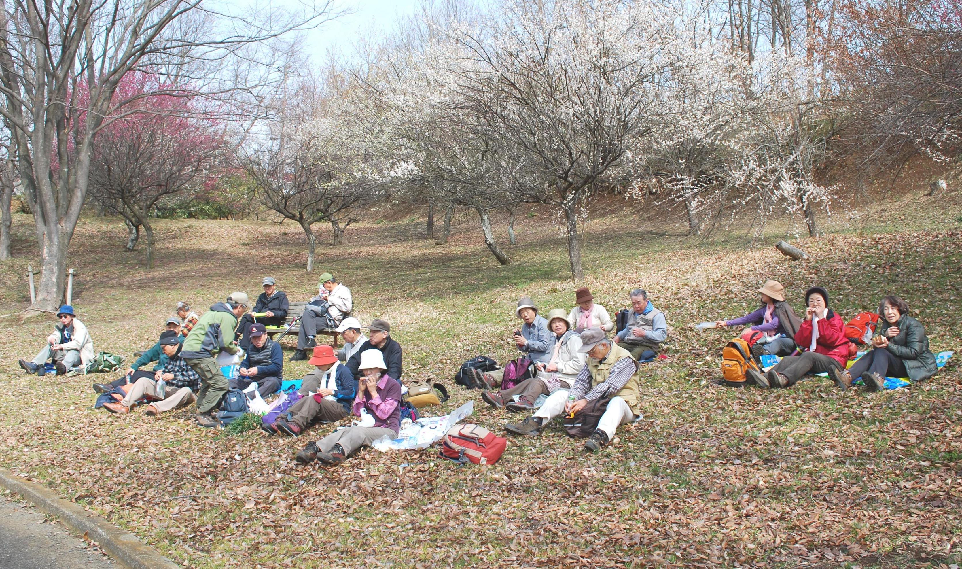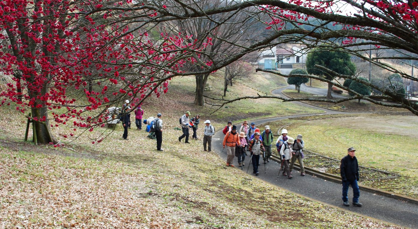 <満開の梅林を右手に> <梅林の向こうに町並み>