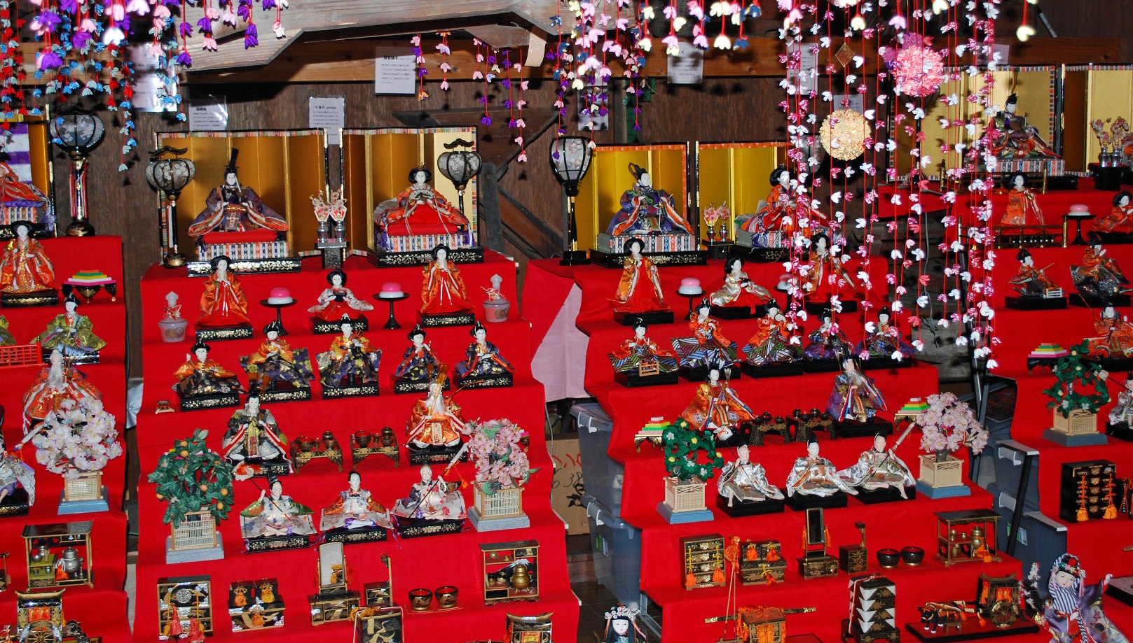 <昼食が終わって出発> <こいの村で展示開催:ひょうたん内裏雛>