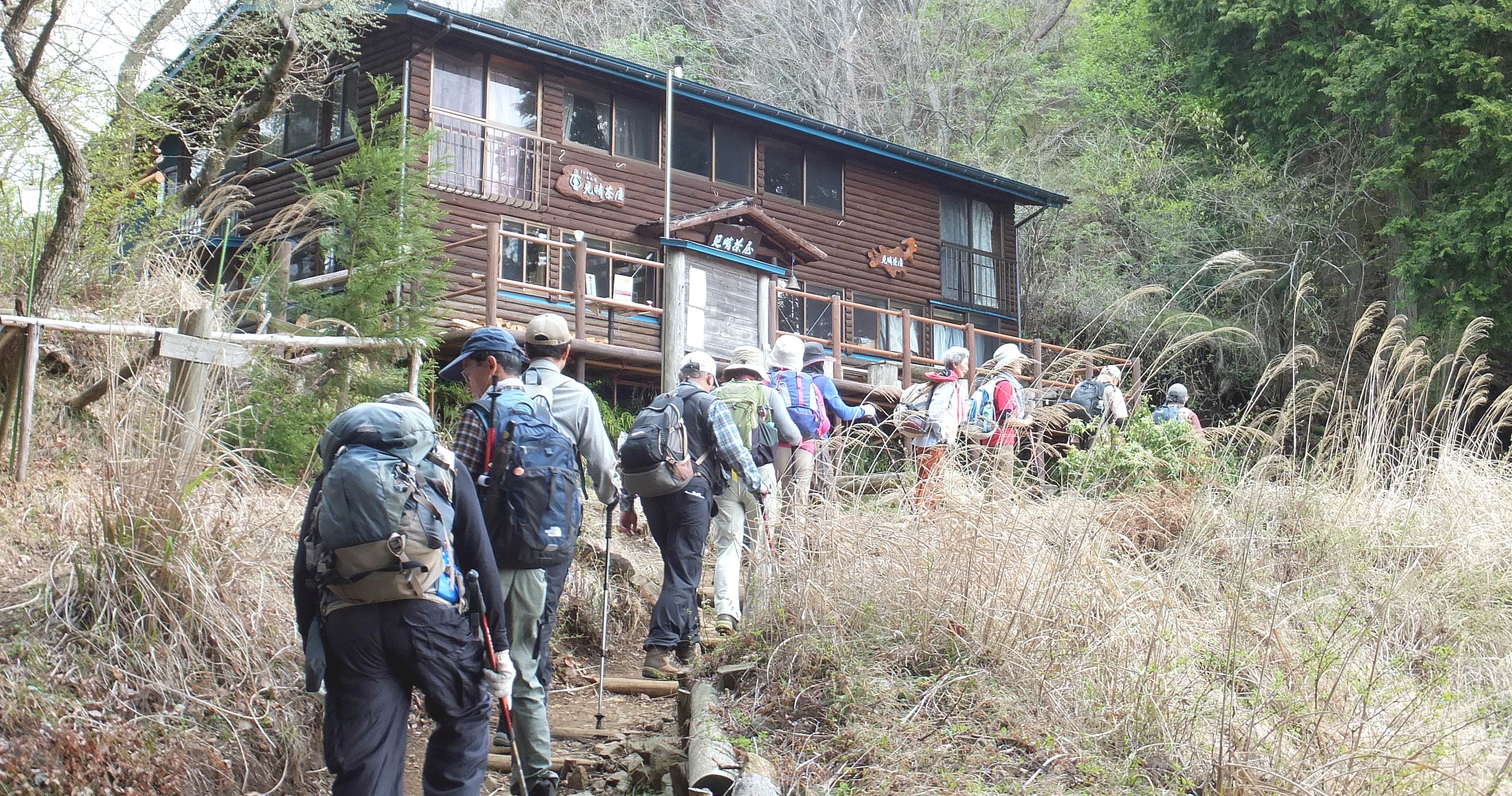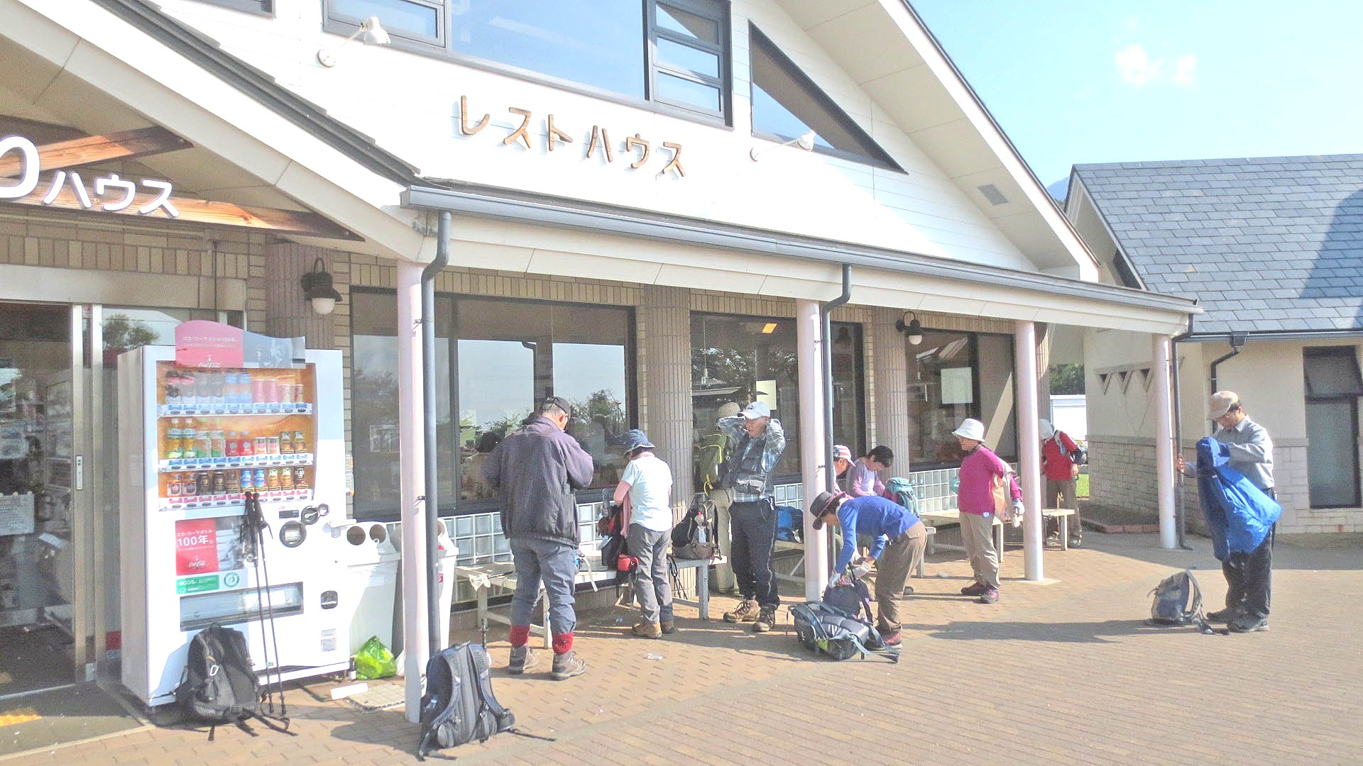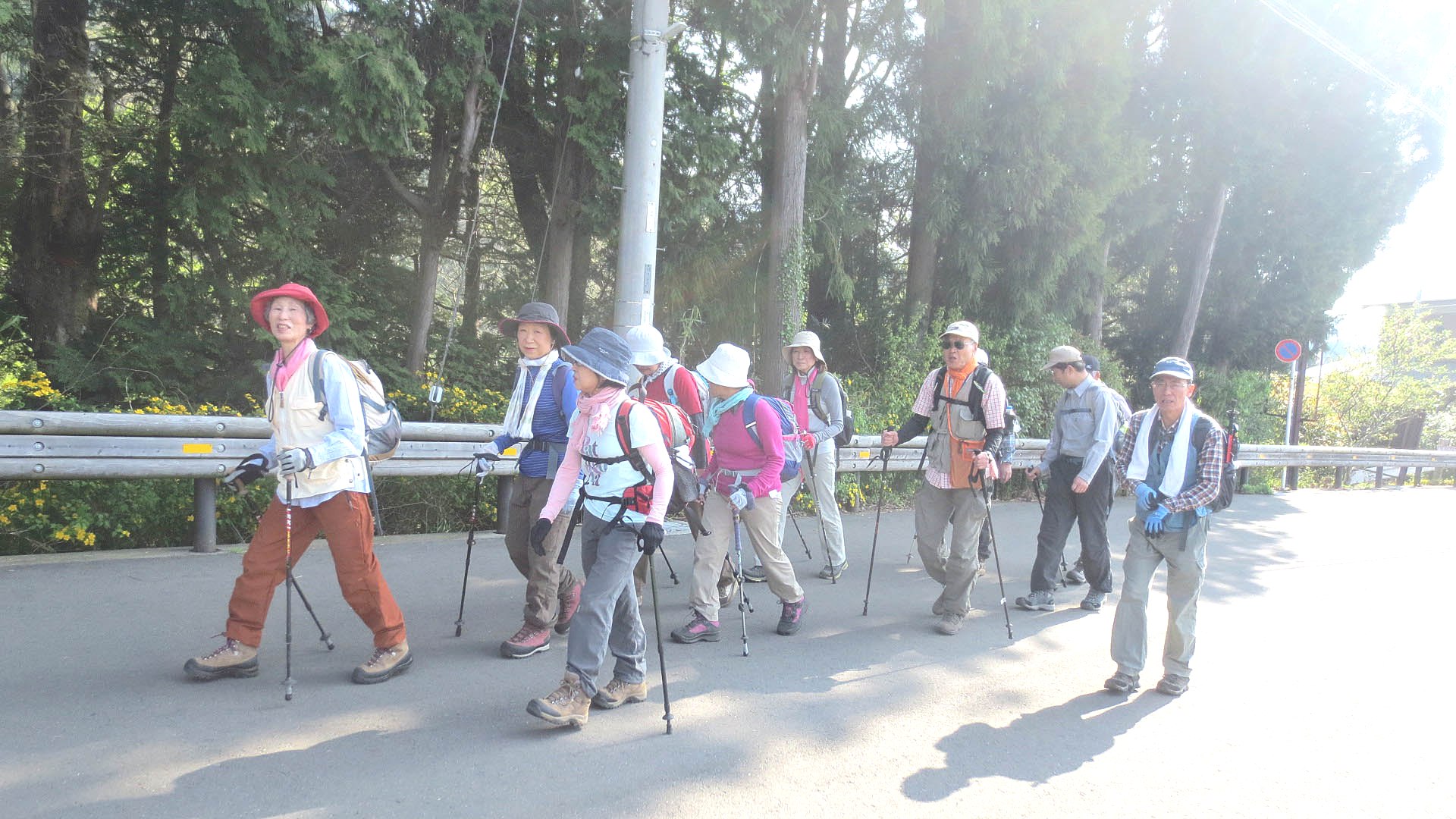 <もうすぐバスターミナル、全員無事到着> <バス停前の蕎麦屋で登頂祝賀会>