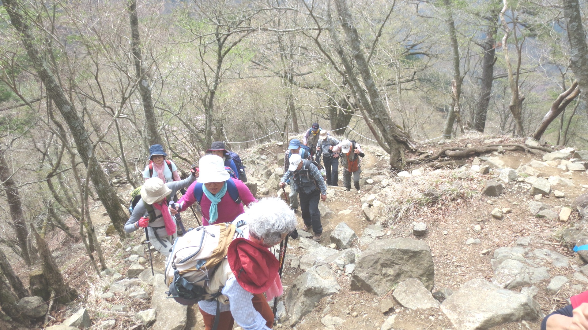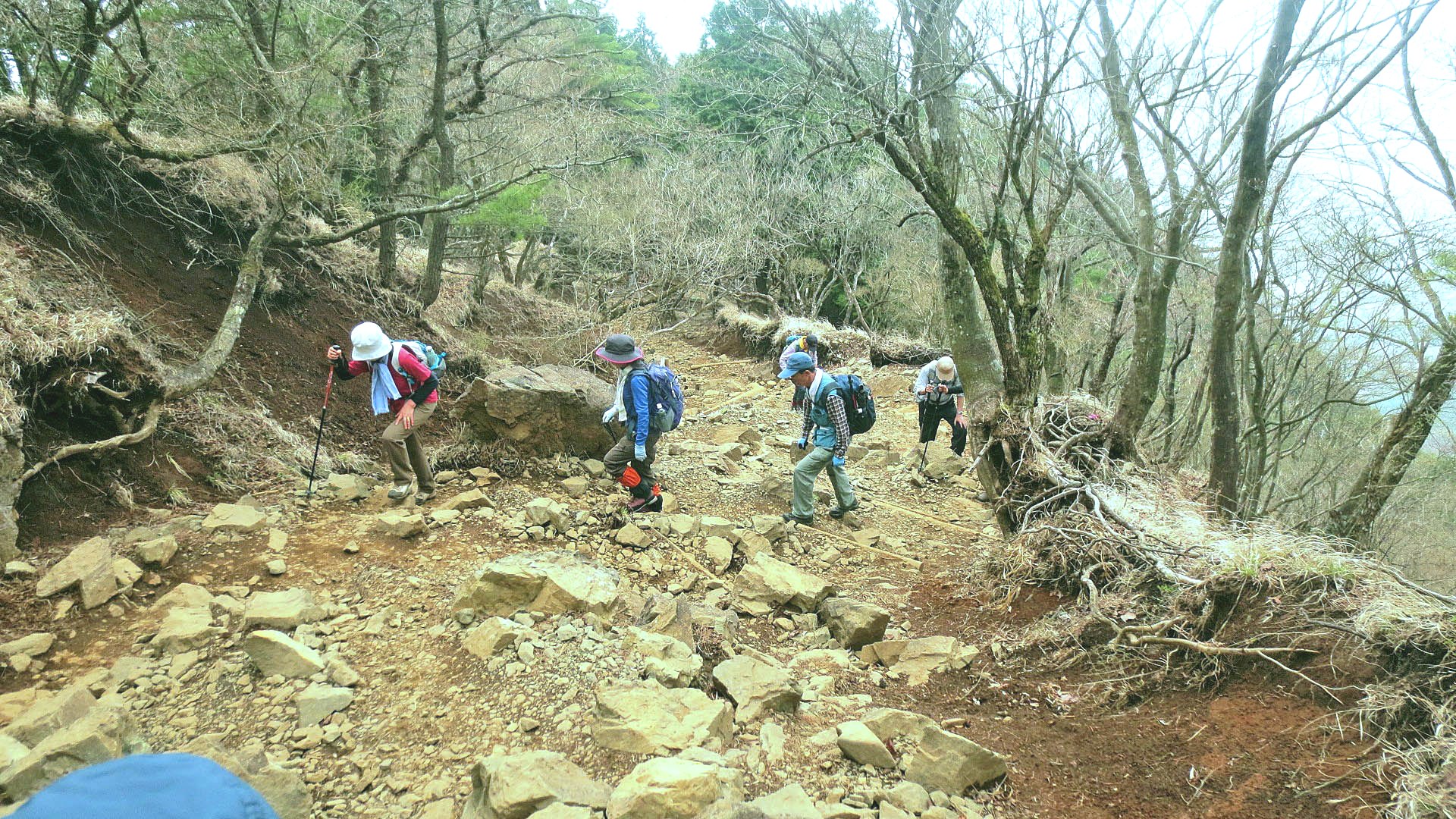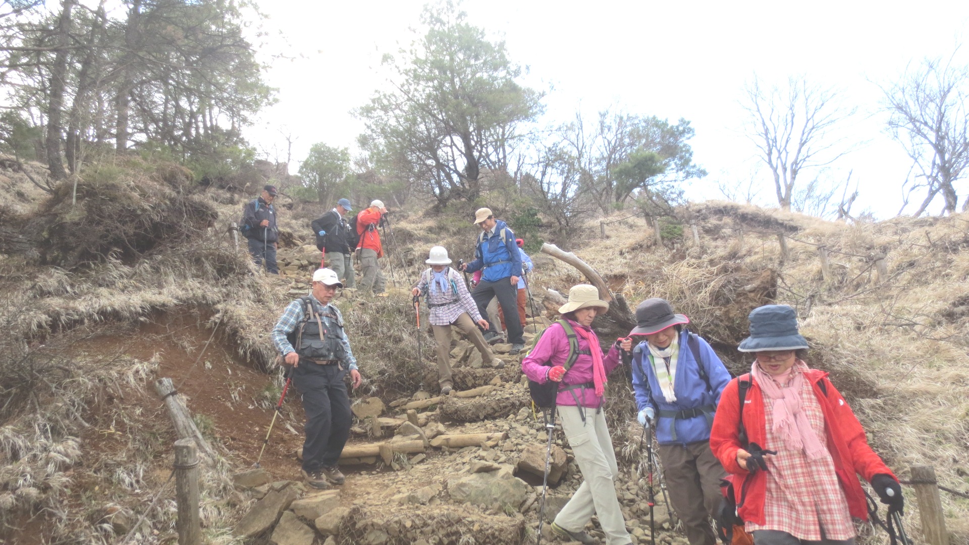 <急勾配を下りて行く、注意!> <下りは早い、皆まだ元気だ、>
