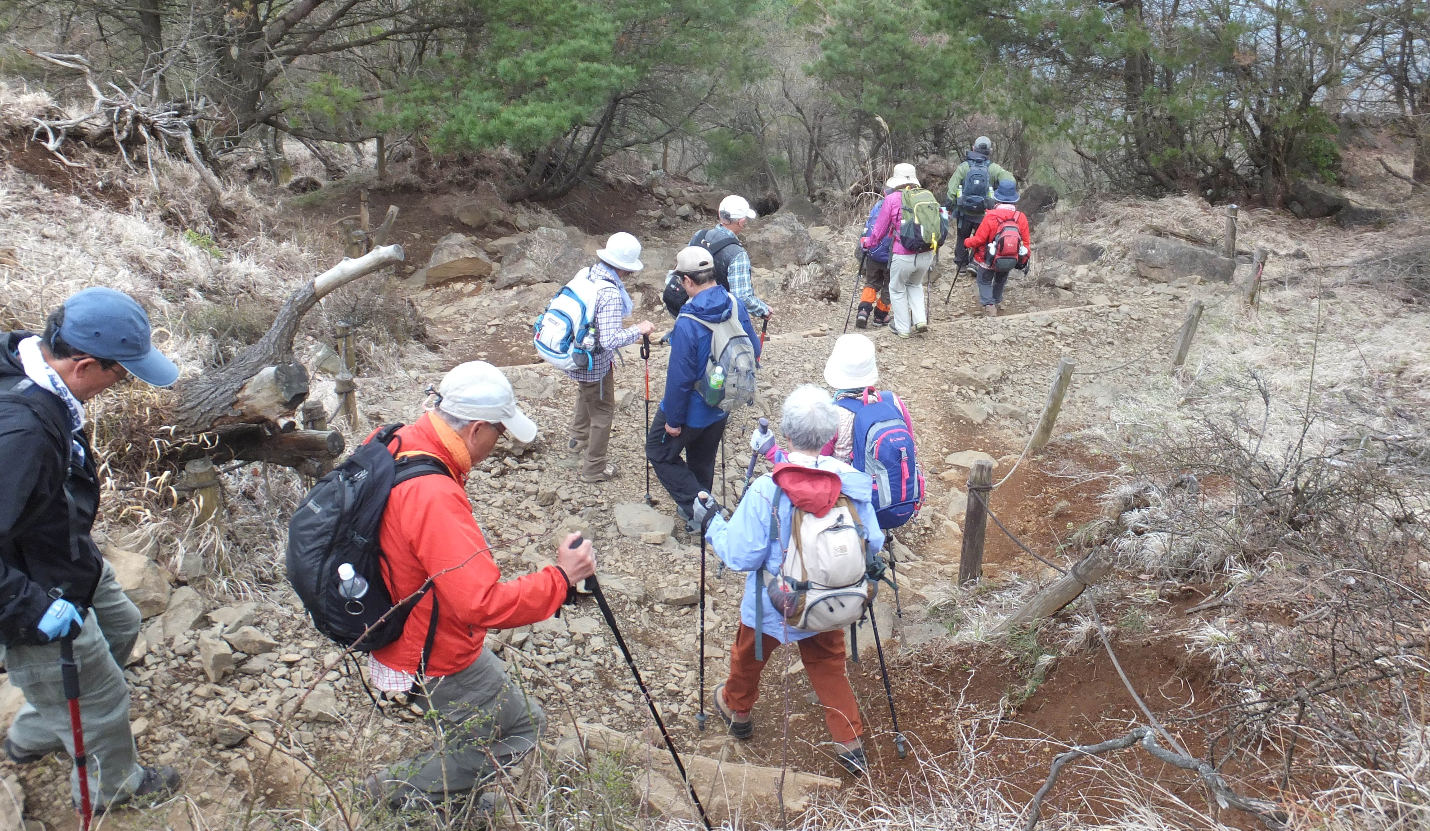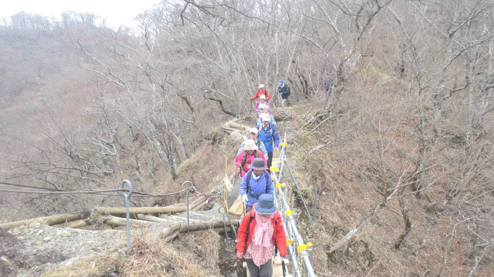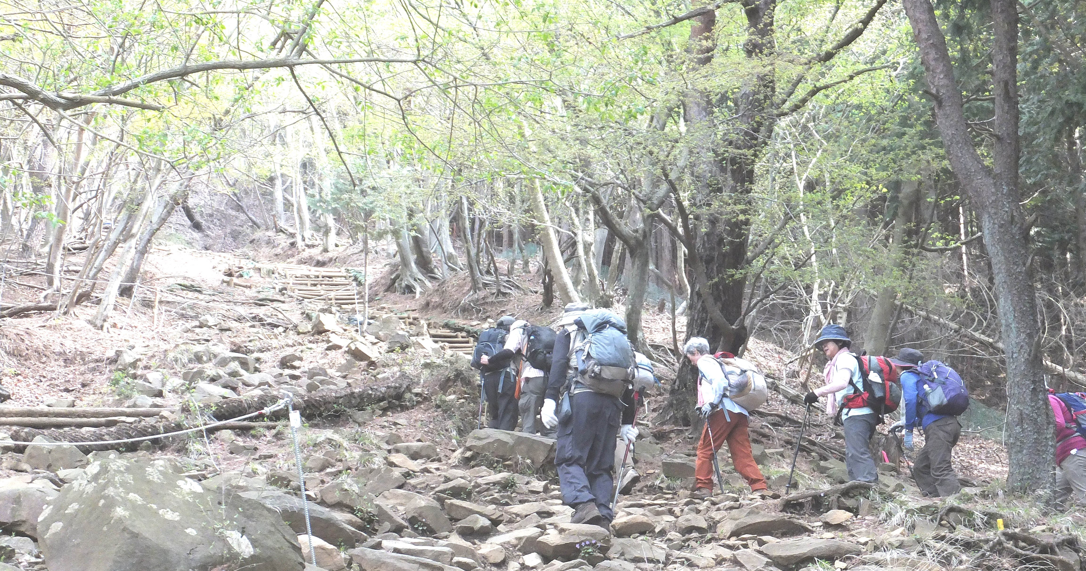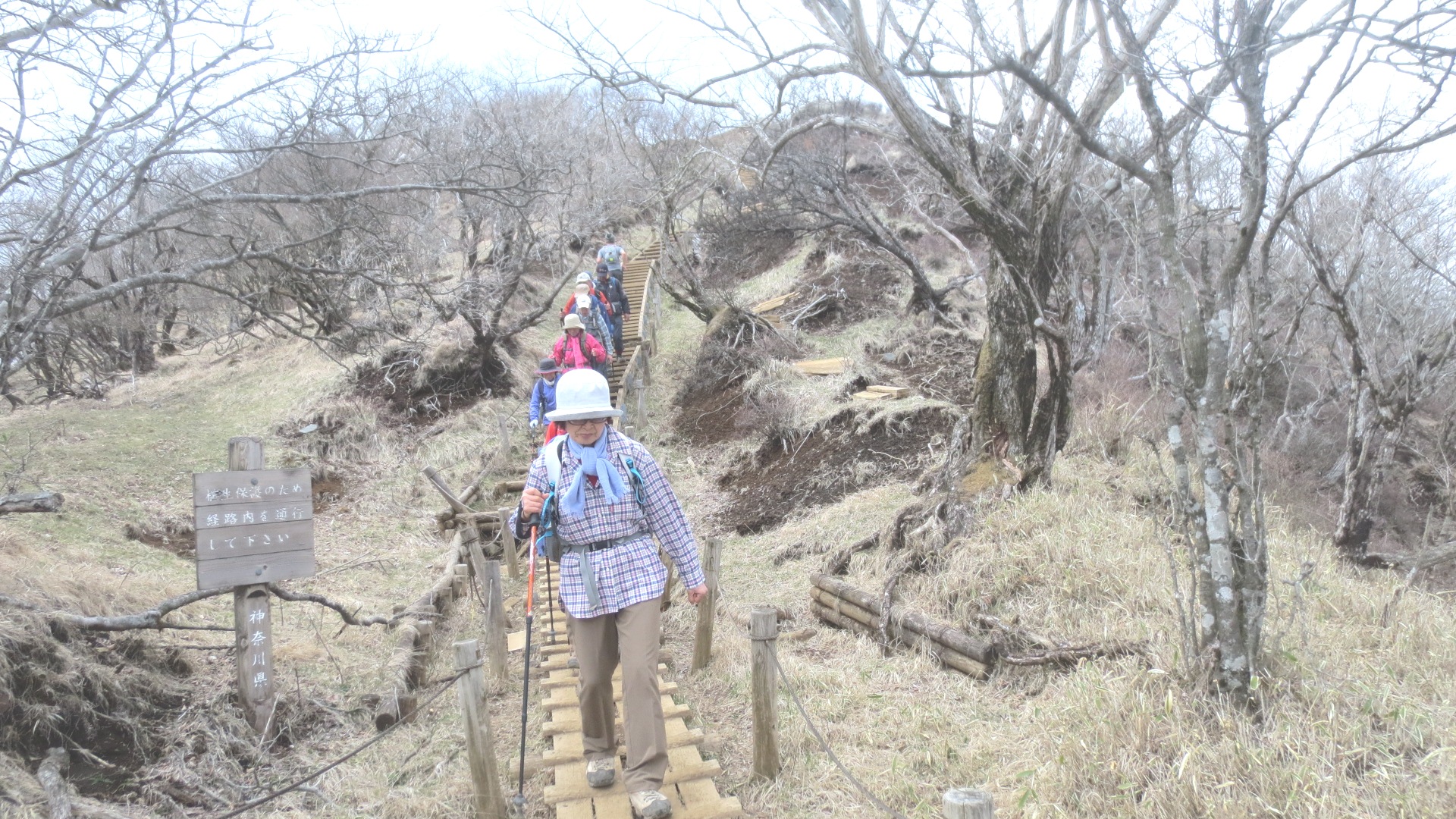 <急勾配を下りて行く、注意!> <下りは早い、皆まだ元気だ、>