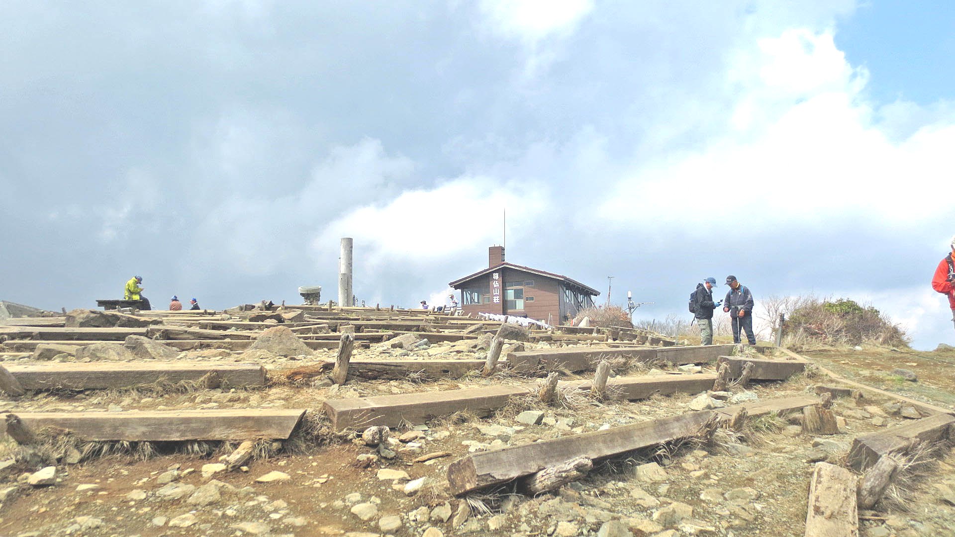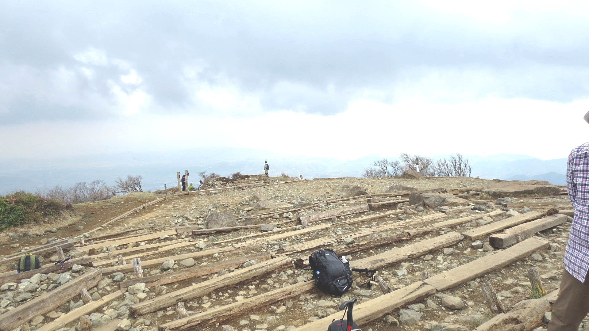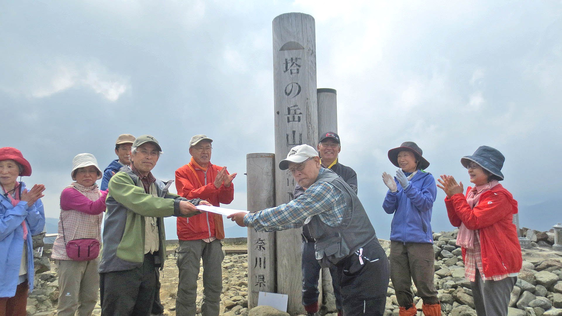 <関根さん、50回参加賞> <山頂から見る風景、ガスってる、富士山は見えない>