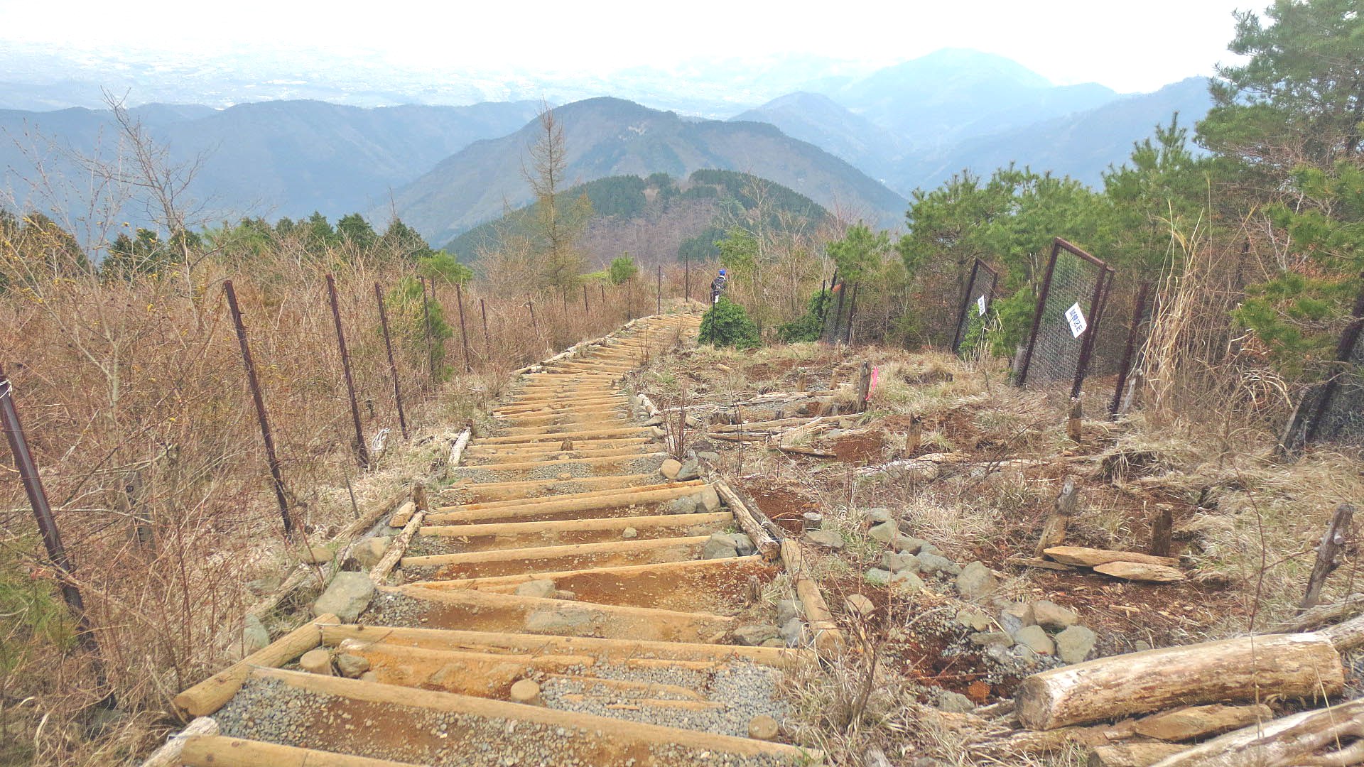 <花立かから見下ろす秦野の街、下は晴れている> <また、長い階段の下りだ>