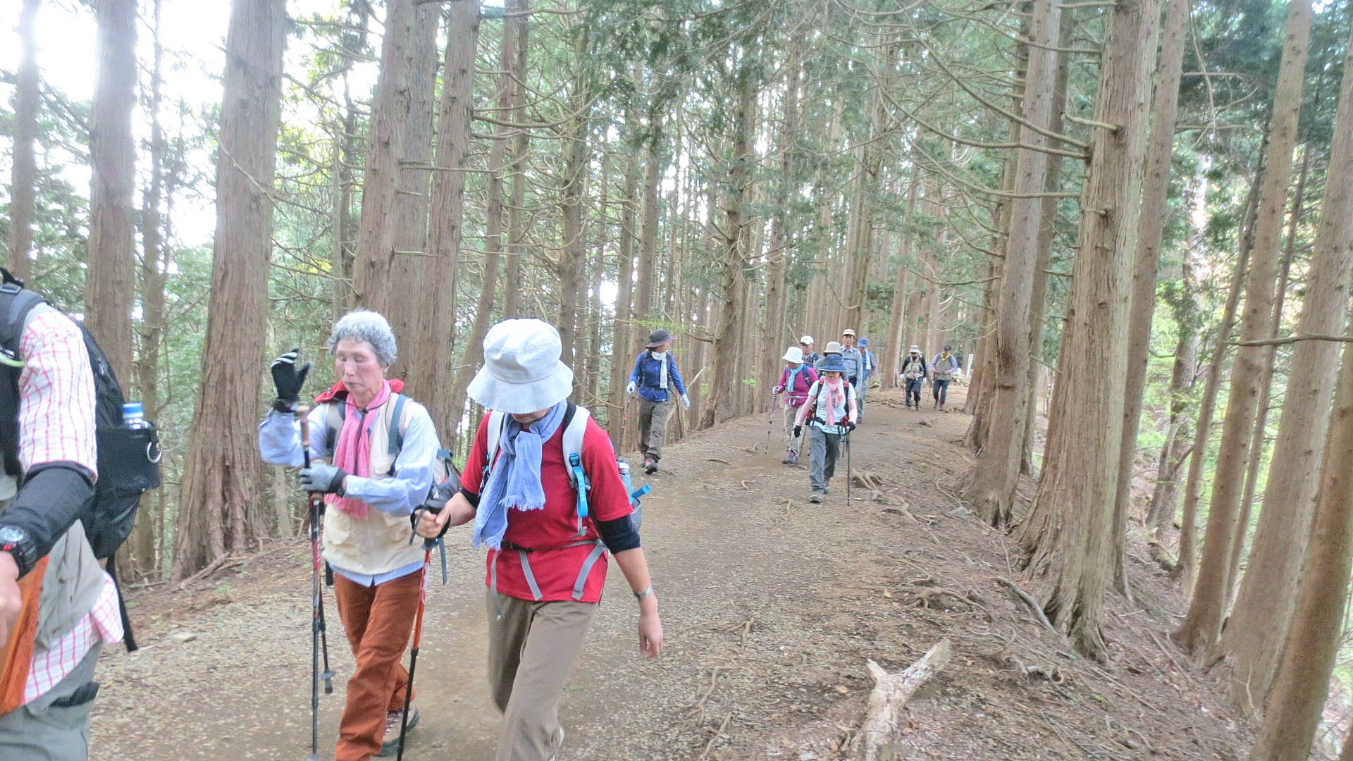 <まずは杉林の中を進む> <続いて緩やかな登山道を行く>