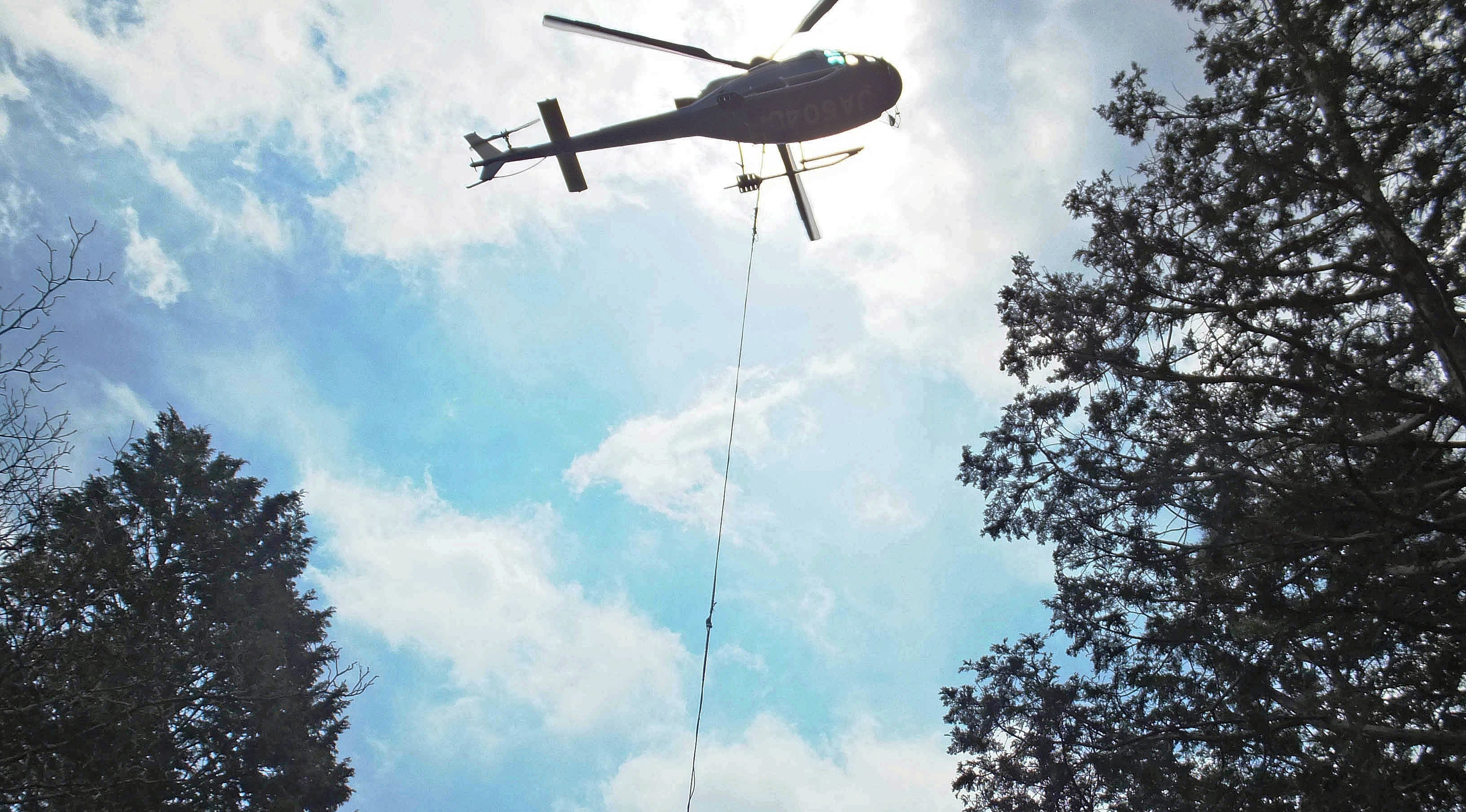 <いったん平坦な道に出る> <ヘリコプターが資材を降ろしている>