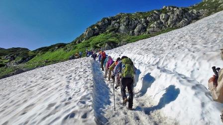 <石畳を歩いて行く> <雪渓を何度も渡って行く>