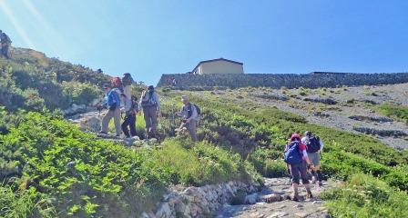 <やっと平坦に出た。山頂小屋が見る> <再び急な岩場だ。慎重に登る>