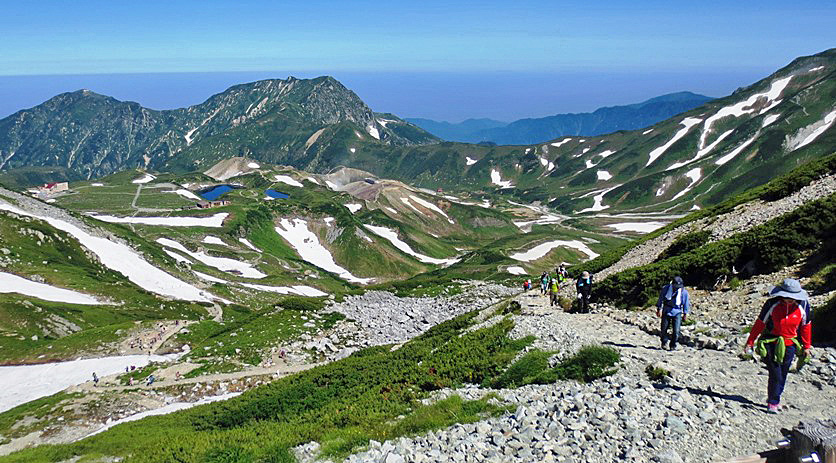 <振り返り見下ろす、室堂の景観> <まだまだ続く山道。これからが本番>
