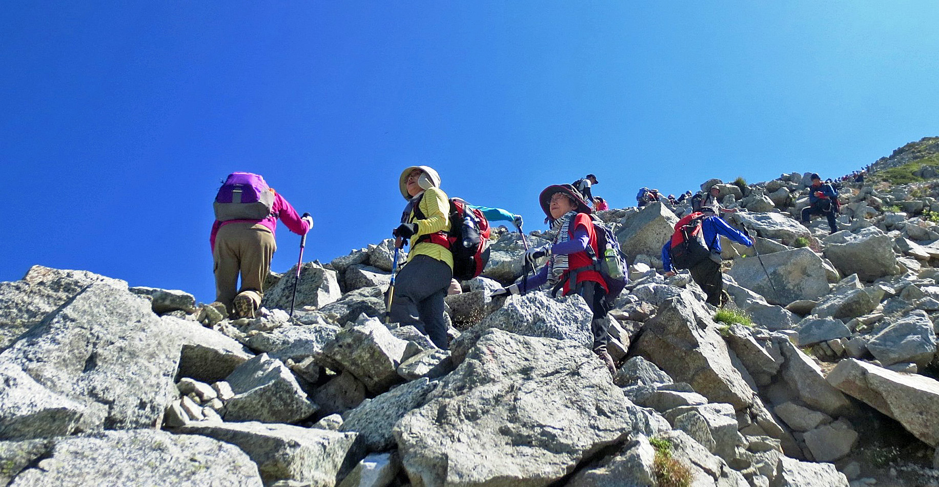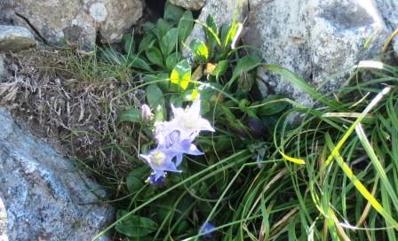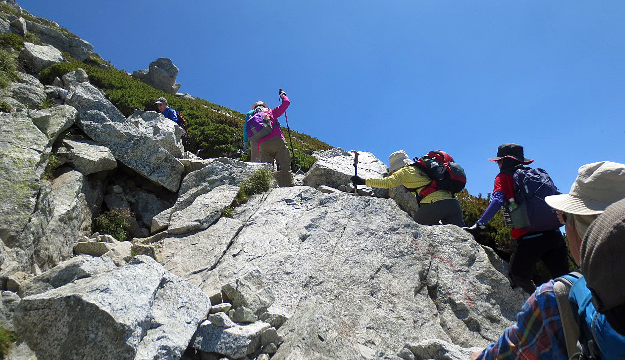 <イワギキョウが咲いてる> <炎天下、厳しい岩場の登りが続く>