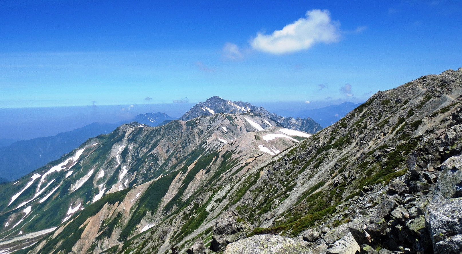 <山頂から望む剣岳の雄姿> <遠くに、槍ヶ岳もクッキリ>