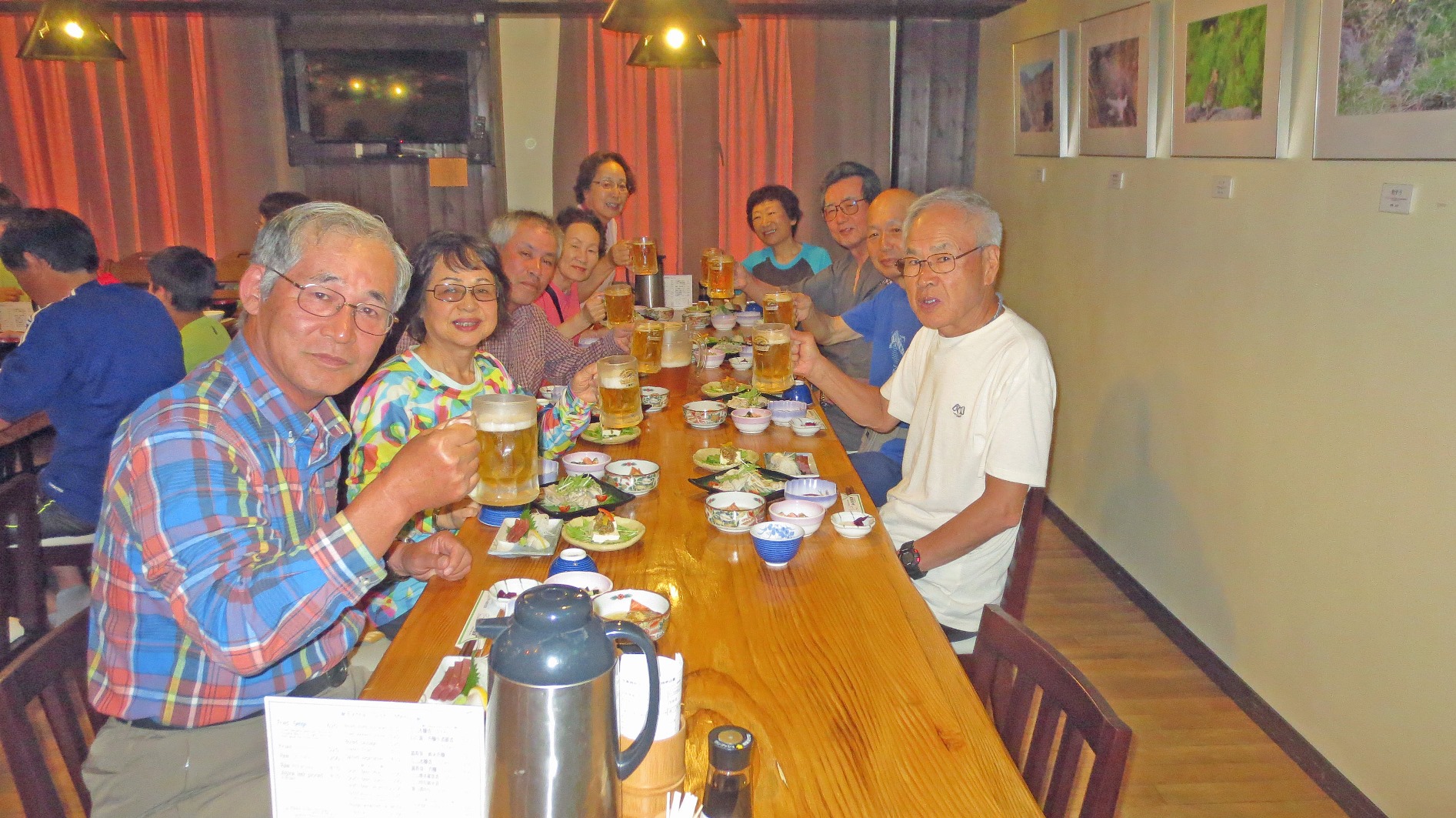 <もうすぐみくりが池温泉だ> <登頂を祝して生ビールで乾杯>