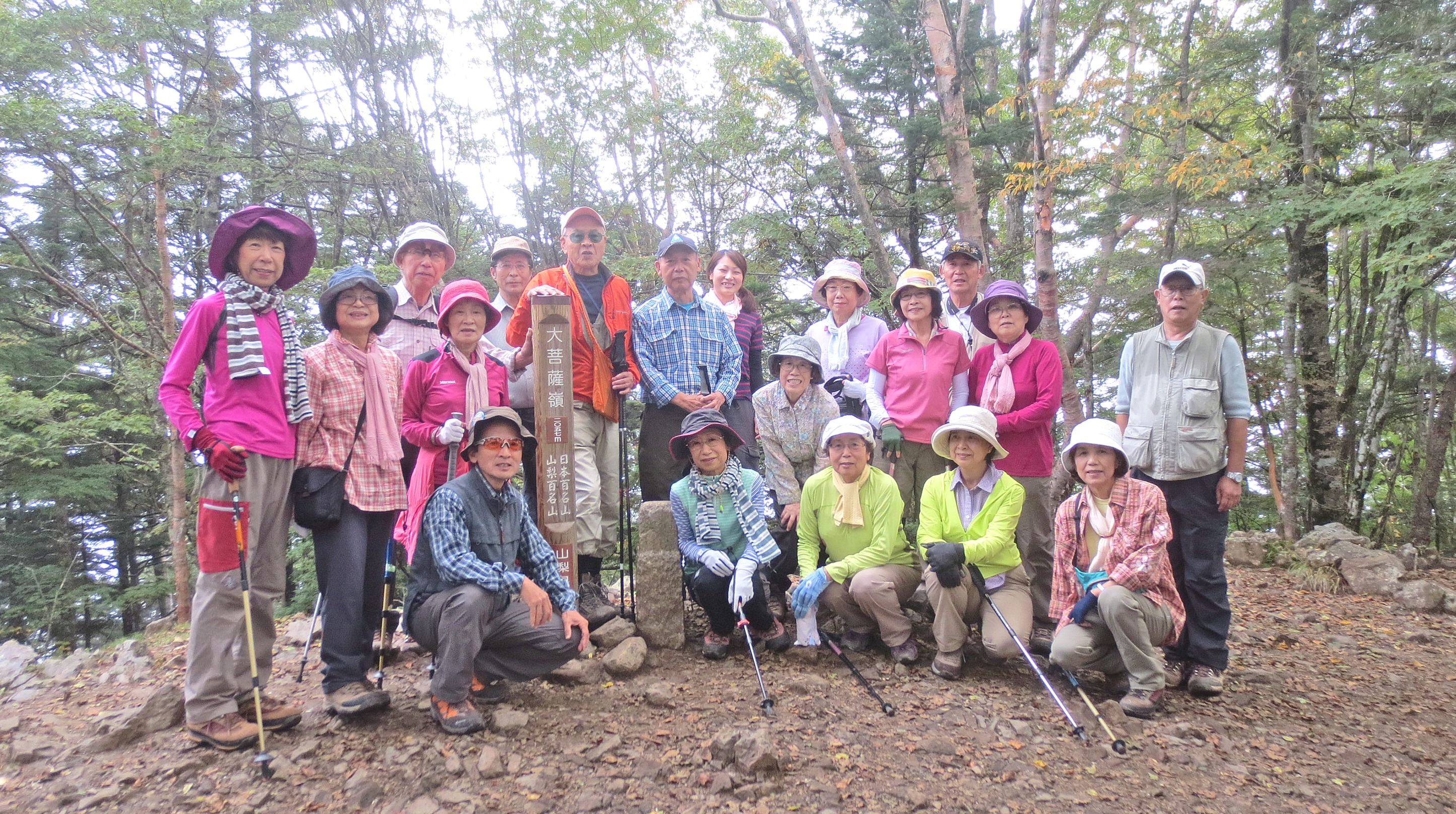 広々とした尾根歩きと、急坂の岩登りを繰り返し、最高峰の大菩薩嶺に到着。記念写真を撮り下山。