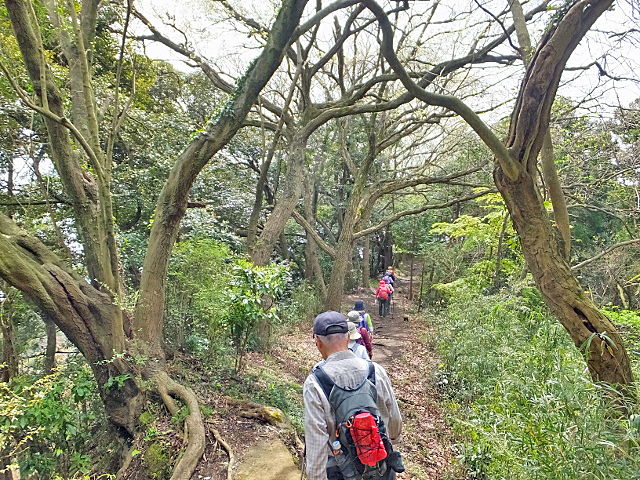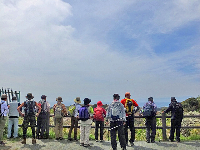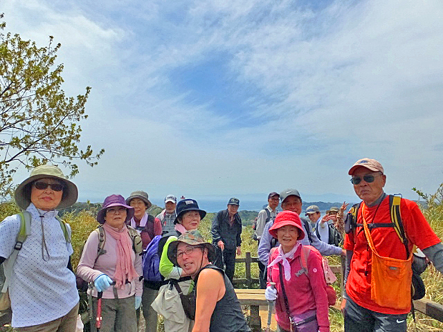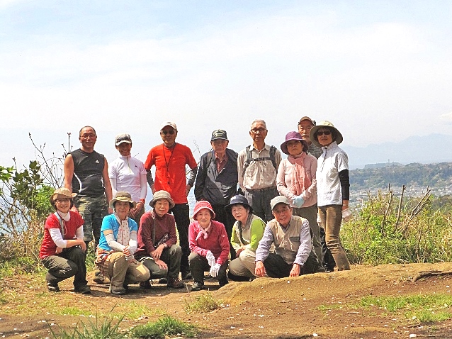 11時頃、衣張山(120.2m)山頂到着、山頂からは絶景の眺めで伊豆箱根、丹沢山系、富士山、江ノ島,逗子方面の眺望を楽しんだ。山頂で鎌倉の海をバックに集合写真。