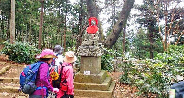 <巡礼峠手前の森林の中を行く> <巡礼峠のお地蔵さん>