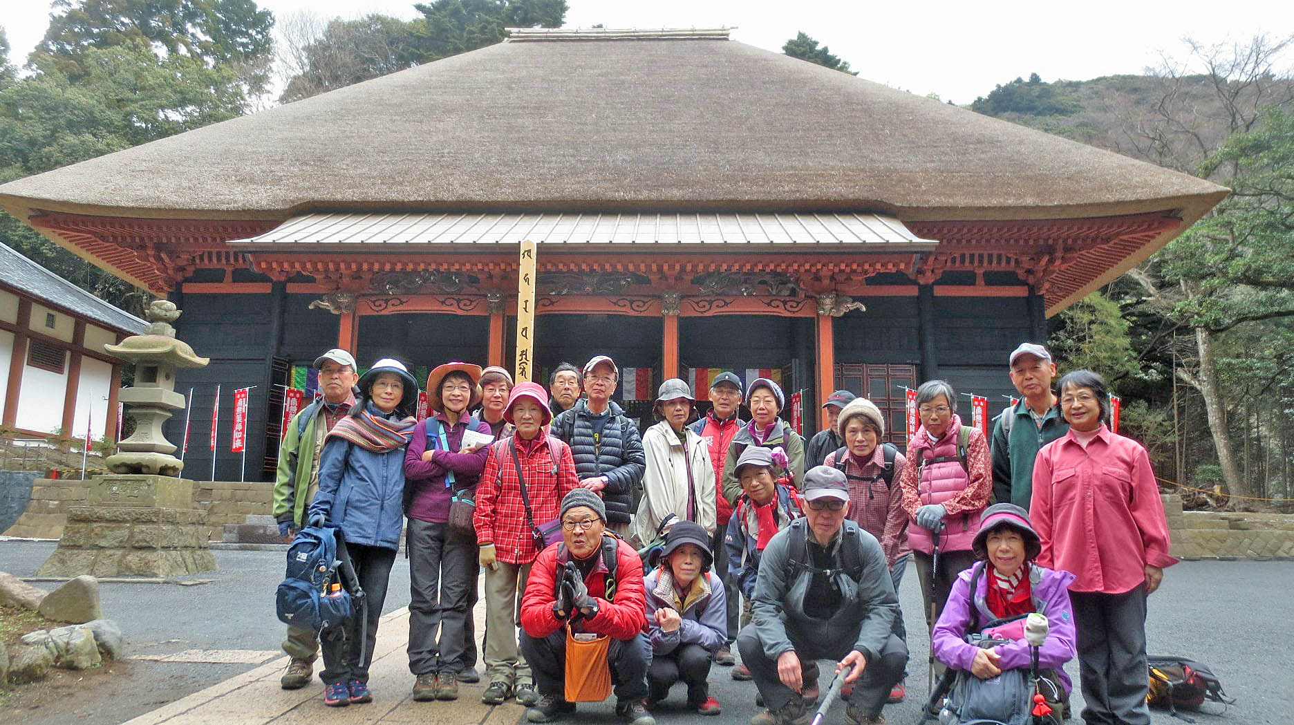 11月に落慶した単層茅葺屋根の本堂に参拝後記念写真。