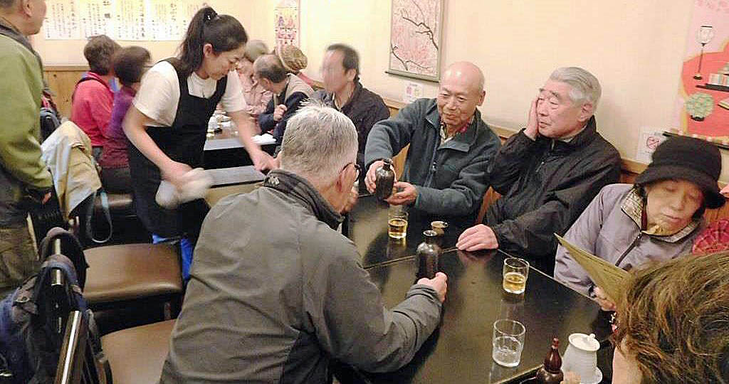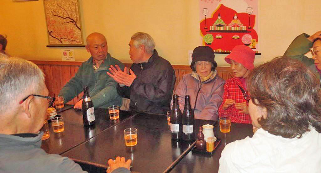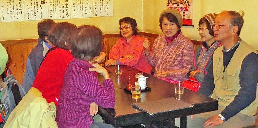 <帰りは蕎麦屋さんで反省会。これも楽しみだよね> <貸し切りで盛りあがっています>