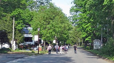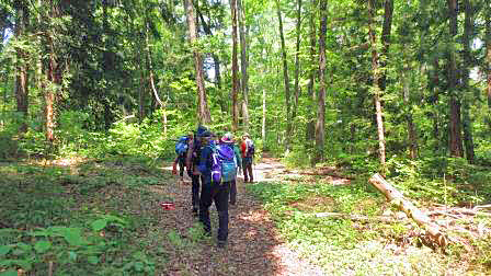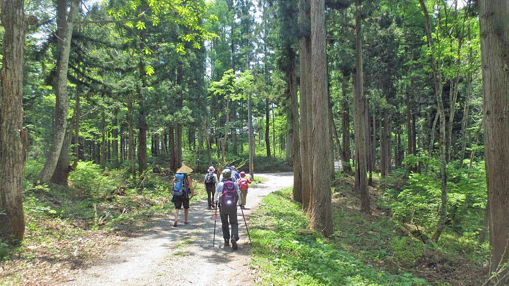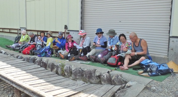 <日陰を見つけ、並んでお昼弁当> <再び新緑で眩しい林道を行く>