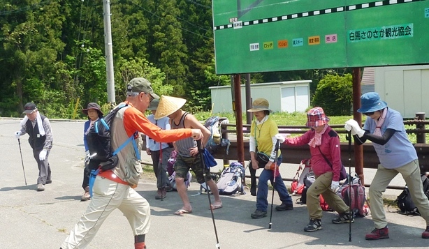 <電車で移動> <まずは千国街道出発前のストレッチ>