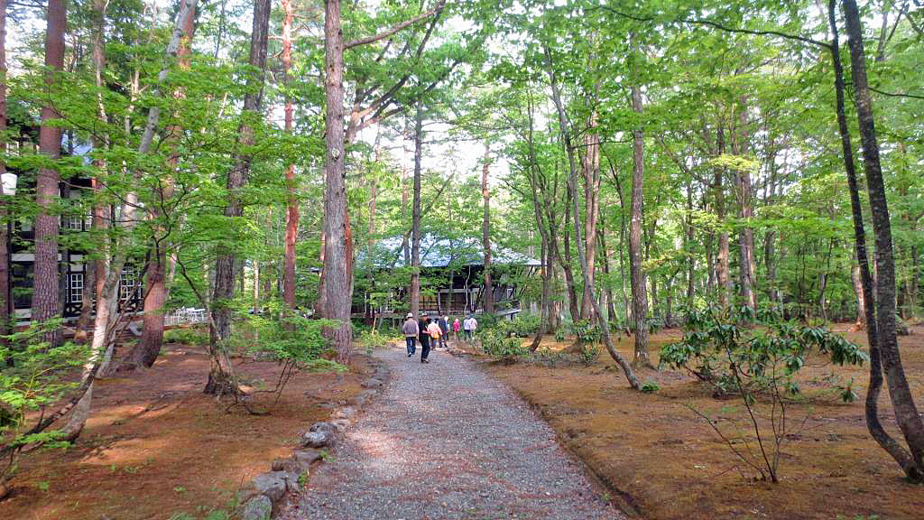 <新緑の森を抜けて諏訪神社へ> <諏訪神社の1000年杉の太さに驚き>