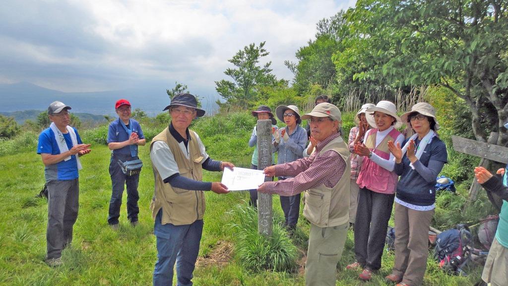 昼食後赤間さんの50回参加表彰。皆さんにお祝いの拍手と尺八の音(他の登山客が演奏)で盛り上がる。