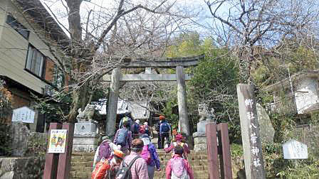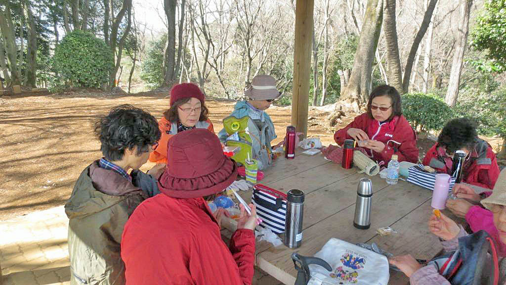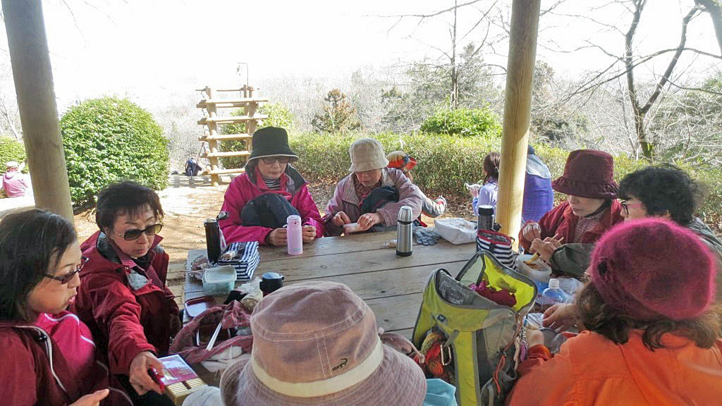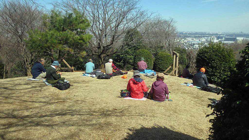 ここで水分補給の休憩を取りながら、結構な高さがある展望台のらせん階段登り、360度の展望を楽しんだ。やや春霞で霞んでいたが関東平野と西側には丹沢の山々、南側には遠くに相模湾まで見え、湘南平の平塚テレビ塔も認識できた。北側は鳶尾山、残念ながらいつもは見える東京スカイツリー霞んでいて認識できなかった。