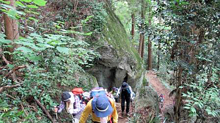 急な岩道を登る 顕鏡寺境内にある蛇木杉の解説