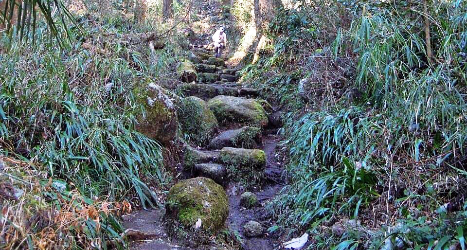 登山道起点の相模湖病院からは,初めから岩がゴロゴロの登りだ。奇岩を眺めながら40分ばかり登ると顕鏡寺に着いた。ここはNHK朝ドラ「花子とアン」に登場した(仲間美由紀が演じた)柳原白蓮のお墓があることで有名な寺だ。