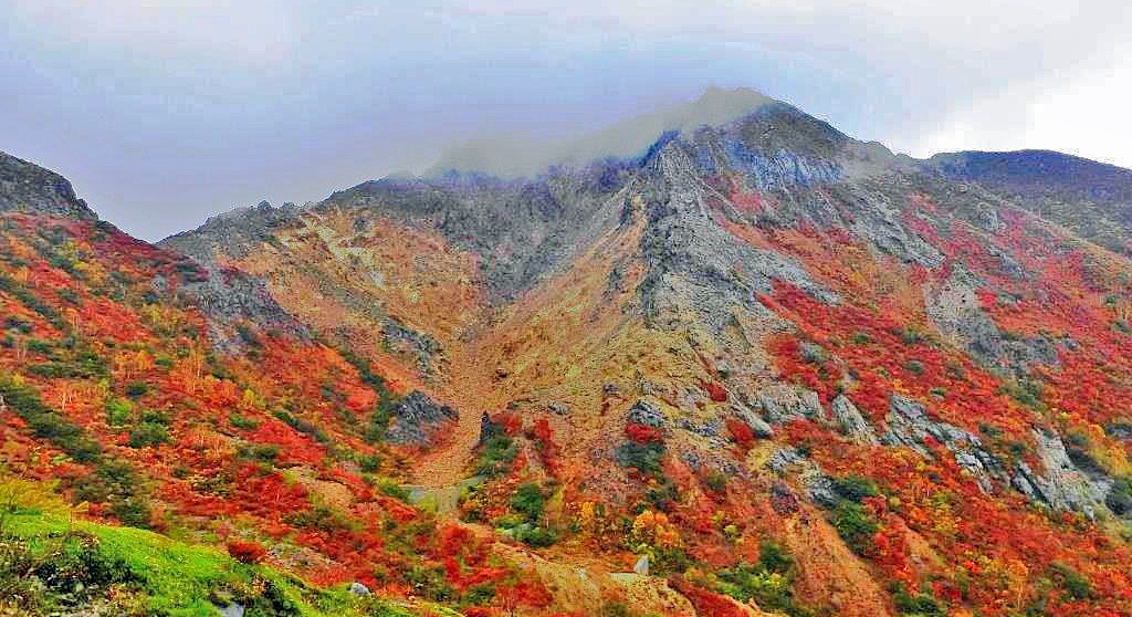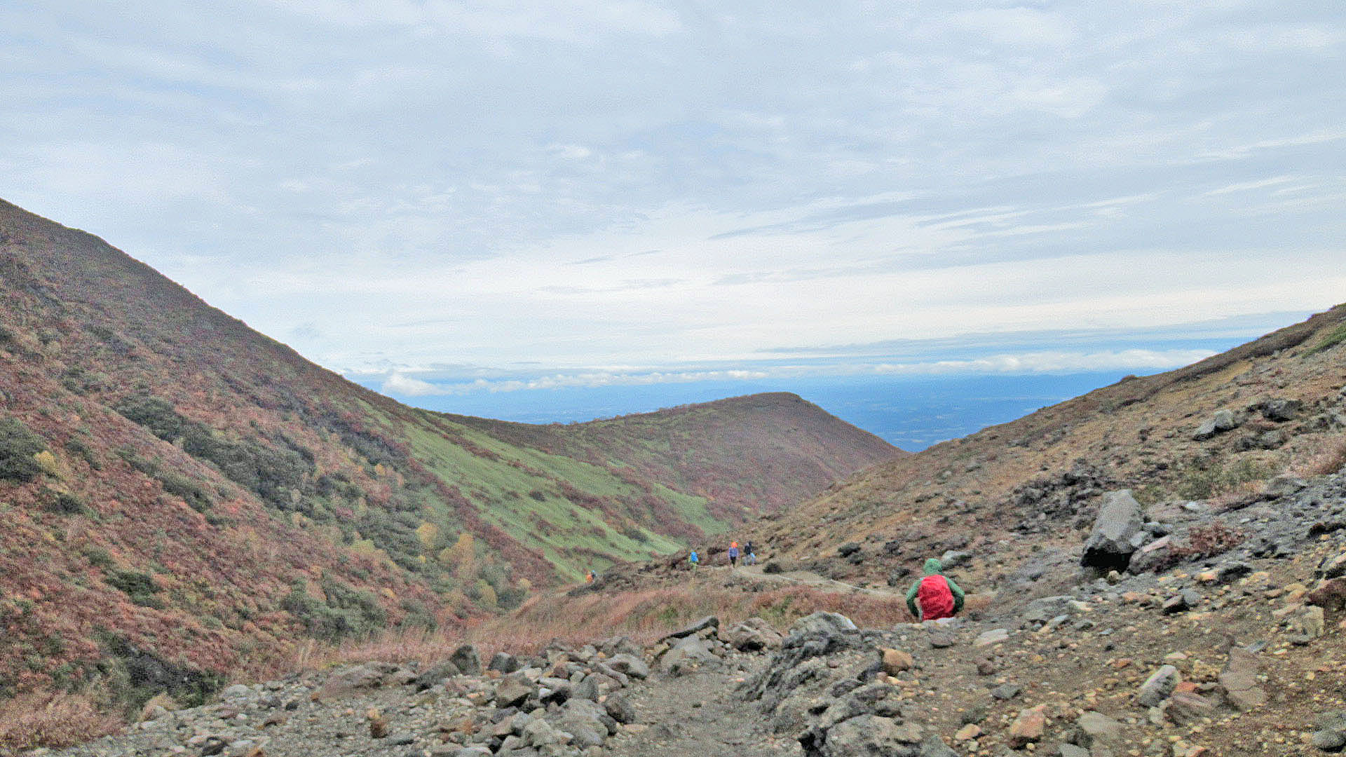 12日は朝8時30分宿を出発。ロープウェイに乗る予定が、強風のため運航中止。やむなく、峠の茶屋から茶臼岳目指し登山開始。