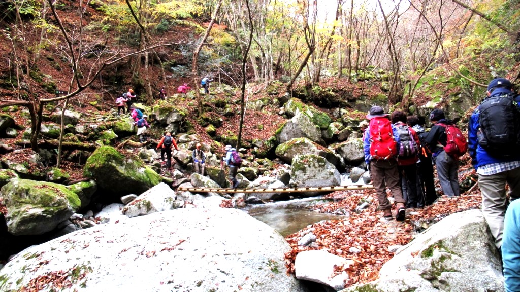 9:50, ビジターセンター裏の大きな吊橋を渡り、最初の堰堤の急な階段を越えて、広い川原へ。この先、沢を何回か渡り、3つ目の堰堤を越え、対岸を行くと、権現山に続く、分岐に出る。10;50着。