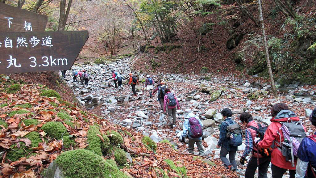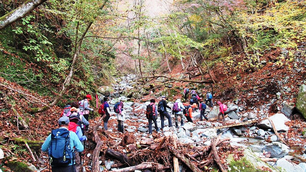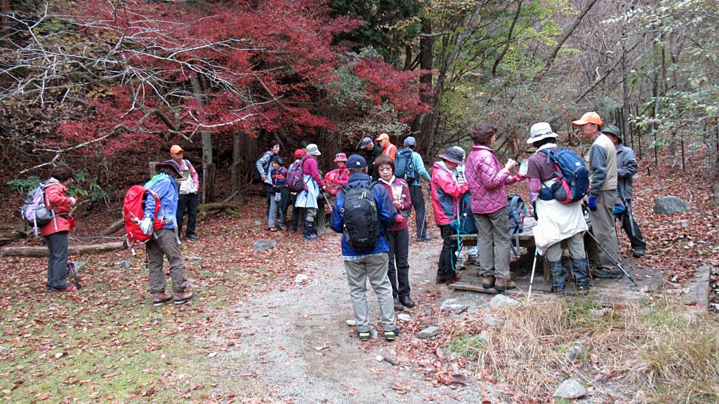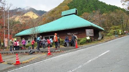 今回は、紅葉と滝の素晴らしい西丹沢の中川川の西沢を遡り、下棚と本棚の滝を巡るコースだ。センター周辺の公園の紅葉は色付いているものの、台風の影響からか?いつもの鮮やかさはいまいちだ。