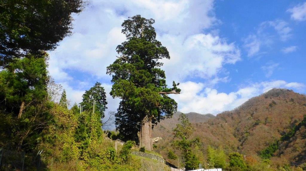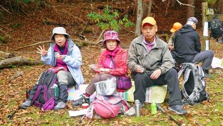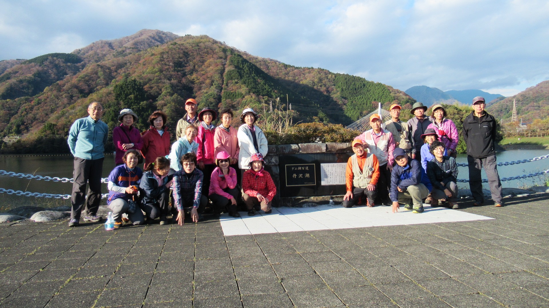 もとの径を戻り、 分岐のベンチの有る場所に戻り昼食。(12:00〜12:40) 気温は低い。下山の午後になって。やっと青空も見え、沢沿いの紅葉もきれいに見えだした。元の道を戻り、ビジアセンター13:30着、ストレッチ後、マイクロバスで帰路へ、途中、中川温泉に近い、箒沢にある国定の樹齢2000年の巨木箒杉を見学と丹沢湖畔のダムサイトにもより、静かな湖畔の紅葉を楽しみ、一路、?老名へ。16:30着。お疲れ様でした。