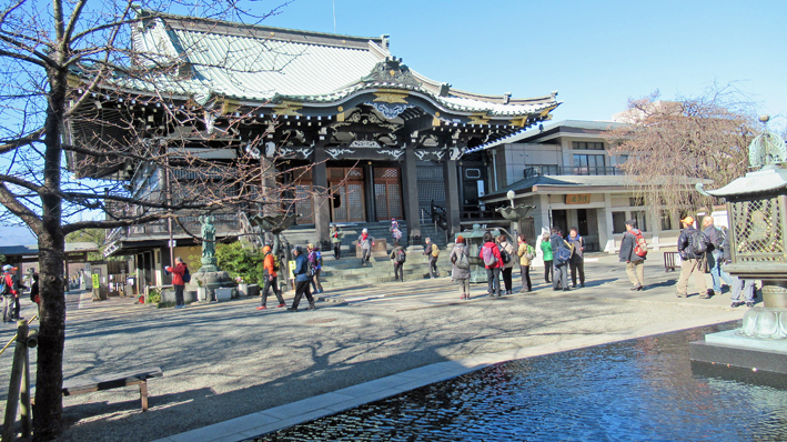 駅前から板東三十三観音霊場八番札所「星の谷観音」に向かい、境内で改めて新年の挨拶と新会員の紹介と座間の歴史、自然環境、湧水を巡る地下水の豊かさ豊かさなど、地元の井上(精)幹事より説明があり、歴史ある梵鐘(片撞座のみ・重要文化財)やイチョウの巨木、大きな法印塔、仁王像など歴史を感じました。
